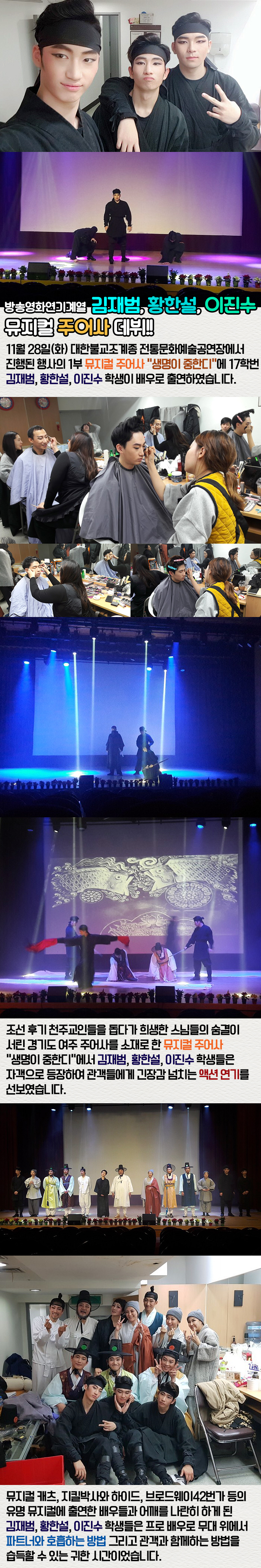 11월 28일(화) 대한불교조계종 전통문화예술공연장에서 진행된 행사의 1부 뮤지컬 주어사 "생명이 중한디"에 17학번 김재범, 황한설, 이진수 학생이 배우로 출연하였습니다.