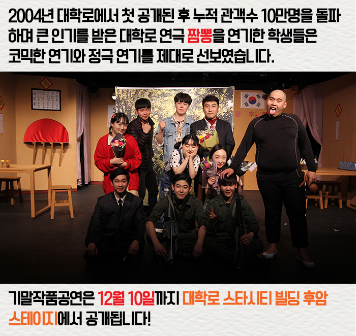 12월 4일(월) 대학로 스타시티 빌딩 후암스테이지에서는 연기예술계열 기말작품공연 짬뽕이 공개되었습니다.