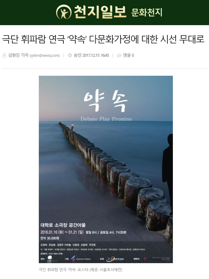 [천지일보=김현진 기자] 작년 무대에 올랐던 극단 휘파람의 연극 ‘약속(연출 위명우)’이 내년 1월 16일부터 21일까지 서울 종로구 대학로 공간아울에서 무대에 오른다.