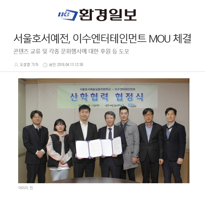 [환경일보] 오성영 기자 = 서울호서예술실용전문학교(이하 서울호서예전) 연기예술계열이 지난 12일 이수엔터테인먼트와 콘텐츠 교류 및 각종 문화행사에 대한 후원, 홍보협조 행사 공동추진으로 상호발전을 도모하기 위한 MOU를 체결했다.