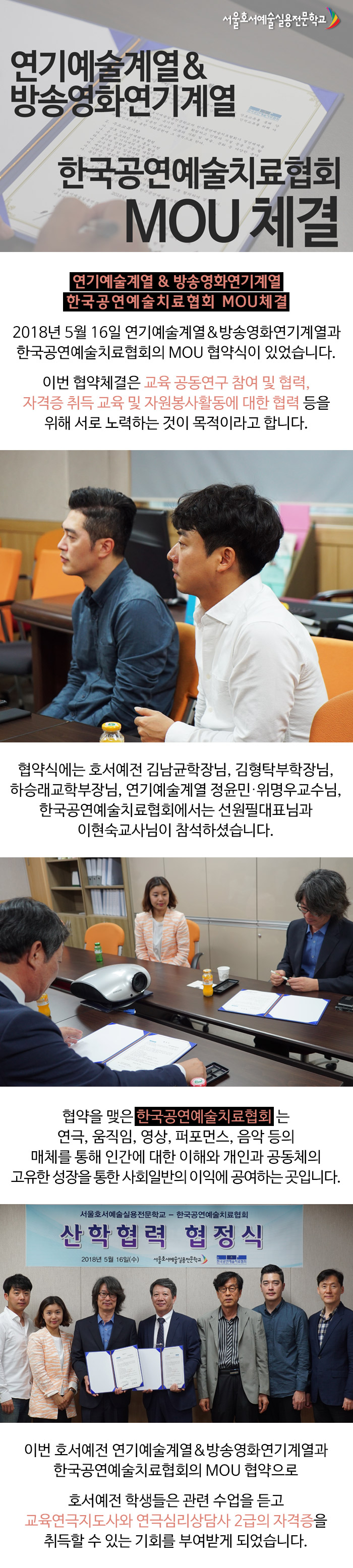 2018년 5월 16일 호서예전 연기예술계열&방송영화연기계열과 한국공연예술치료협회의 MOU 협약식이 있었습니다.