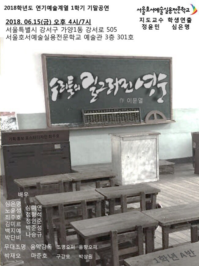 연기예술계열 학생들의 1학기 기말작품공연 <우리들의 일그러진 영웅>이 6월 15일(금) 오후 4시/ 7시에 본교 예술관 301호 소극장에서 진행 됩니다.