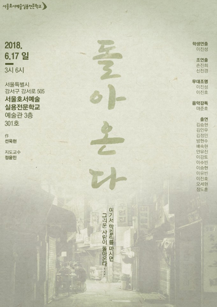 연기예술계열 학생들의 1학기 기말작품공연 <돌아온다>가 6월 17일(일) 오후 3시/ 6시에 본교 예술관 301호 소극장에서 진행 됩니다.