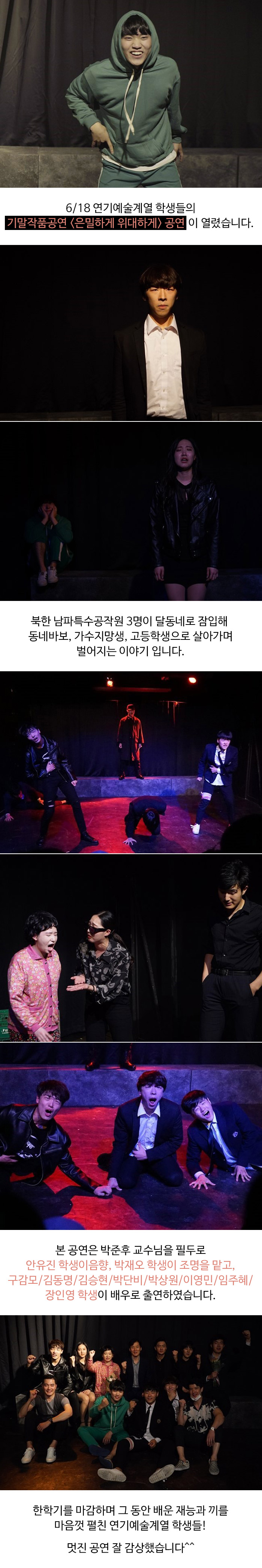 6월18일 월요일 연기예술계열 학생들의 기말작품 <은밀하게 위대하게> 공연이 진행되었습니다.
