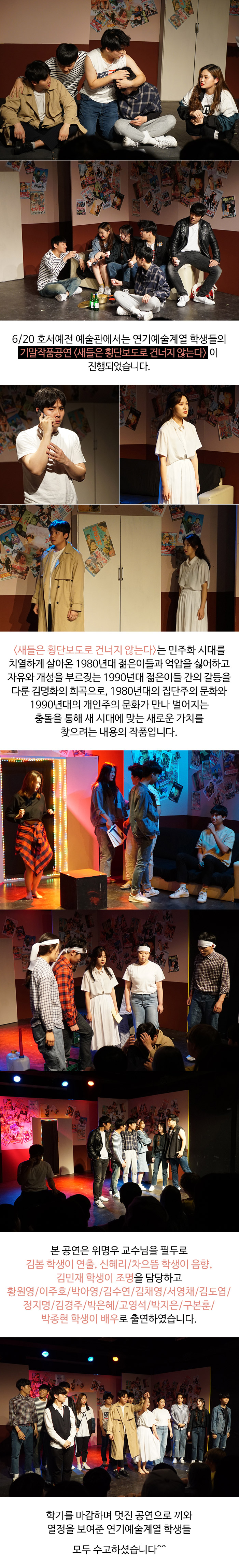 6/20 호서예전 예술관에서는 연기예술계열 학생들의 기말작품 <새들은 횡단보도로 건너지 않는다> 공연이 진행되었습니다.