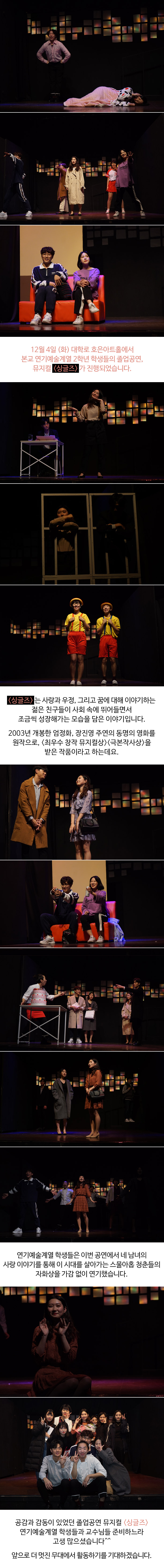 12월 4일 (화) 대학로 호은아트홀에서 본교 연기예술계열 2학년 학생들의 졸업공연, 뮤지컬 '싱글즈' 가 진행되었습니다.