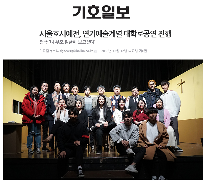 서울호서예술실용전문학교(이하 호서예전) 연기예술계열이 지난 1일부터 2일까지 양일간 대학로 호은아트홀에서 연극 ‘니 부모 얼굴이 보고싶다’를 공연했다고 12일 전했다.