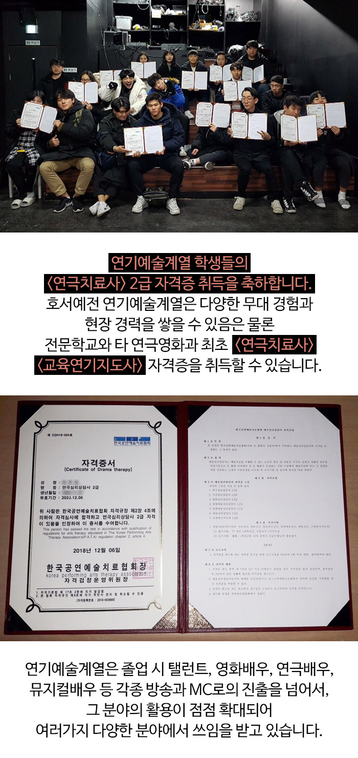 호서예전 연기예술계열은 다양한 무대 경험과 현장 경력을 쌓을 수 있음은 물론 전문학교와 타 연극영화과 최초 '연극치료사', '교육연기지도사' 자격증을 취득할 수 있습니다.