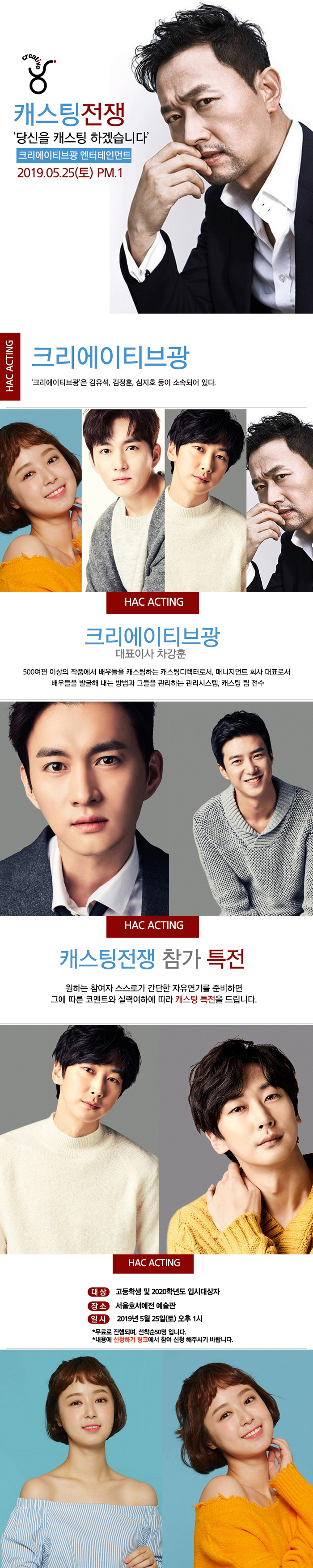 2019 캐스팅전쟁 <당신을 캐스팅 하겠습니다>이 오는 5월 25일 오후1시에 본교 예술관에서 아래와 같이 진행됩니다.