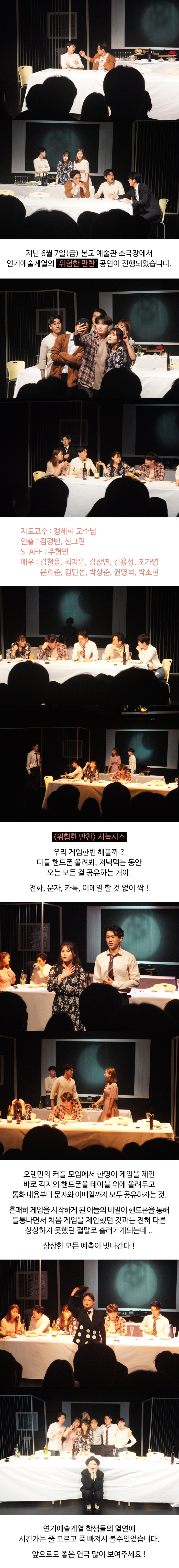지난 2019년 6월 7일(금) 본교 예술관 소극장에서 연기예술계열의 '위험한 만찬' 공연이 진행되었습니다.