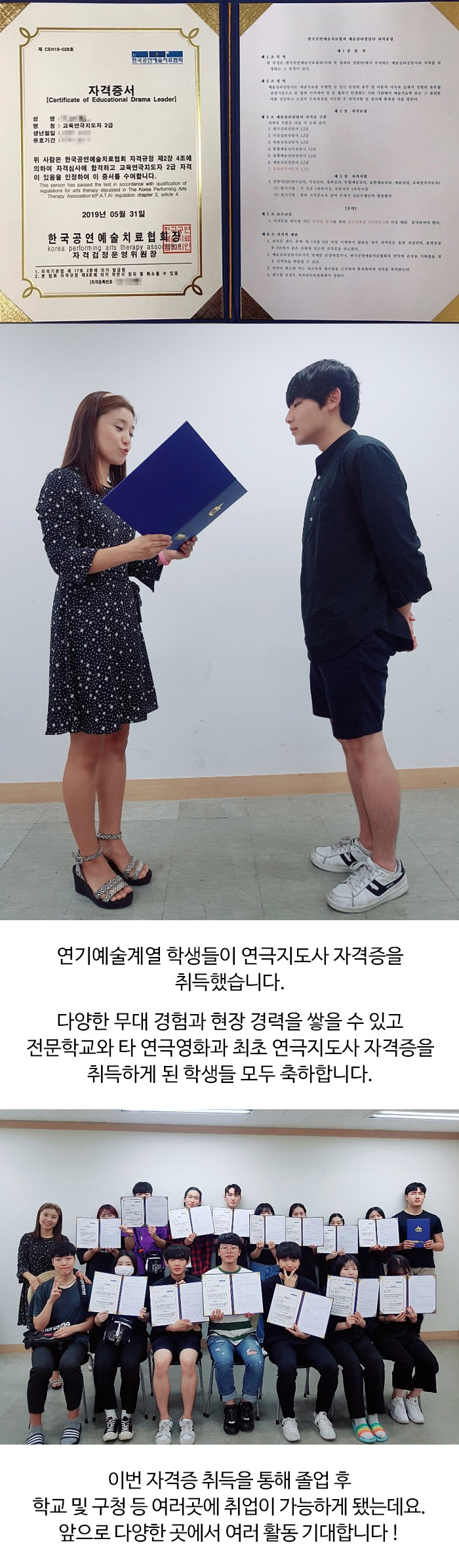 다양한 무대 경험과 현장 경력을 쌓을 수 있고 전문학교와 타 연극영화과 최초 연극지도사 자격증을 취득하게 된 학생들 모두 축하합니다.