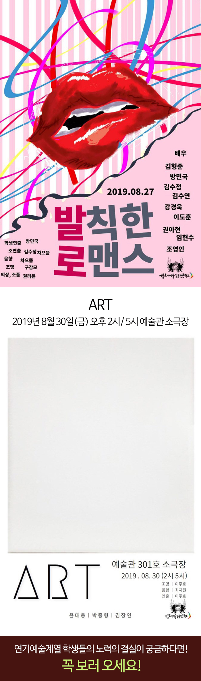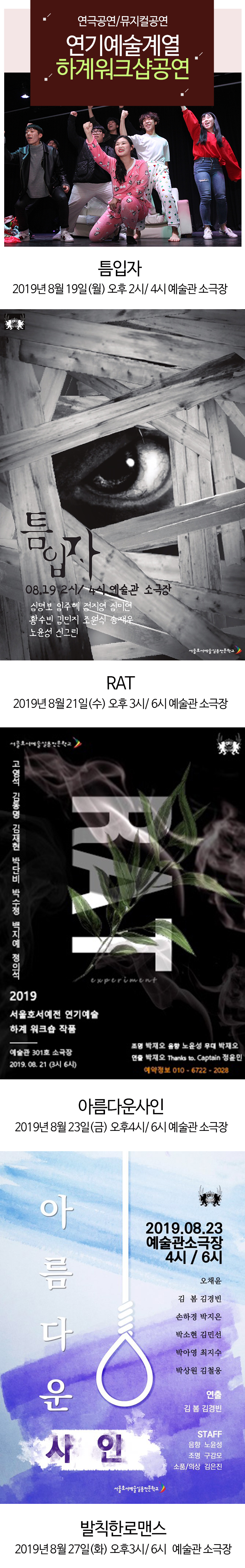 연기예술계열에서는 오는 8월 19일(월)부터 8월30일(금)까지 본교 소공연장에서 여름방학 워크샵공연을 아래와 같이 실시합니다.