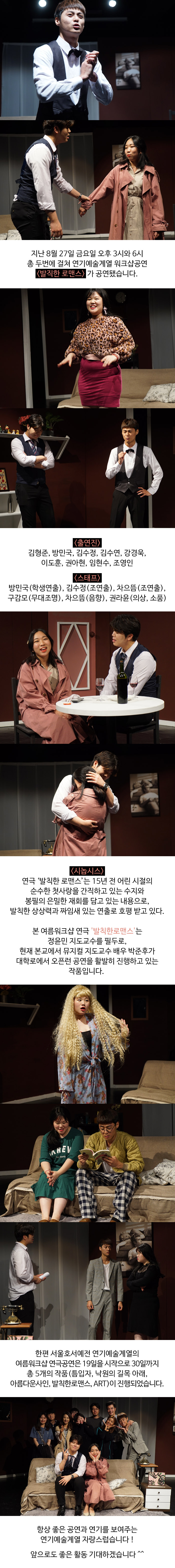 지난 8월 27일 금요일 오후 3시와 6시 총 두번에 걸쳐 연기예술계열 워크샵공연 '발직한 로맨스'가 공연됐습니다.