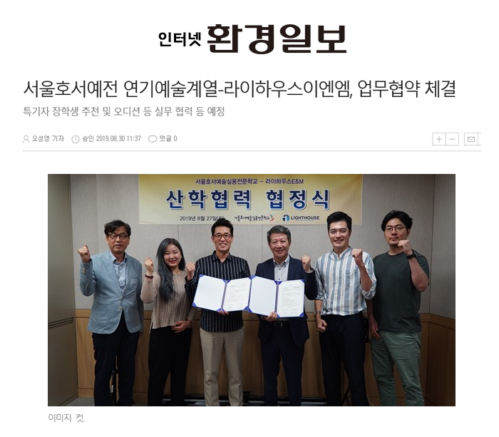 서울호서예술실용전문학교(이하 서울호서예전) 연기예술계열이 영화,드라마 제작, 매니지먼트 및 연기아카데미 사업까지 영역을 넓히고 있는 ㈜라이하우스 E&M과 사회문화 및 예술 등 다양한 분야에서 다양한 교류와 협력을 통해 상호 발전을 도모하기 위한 MOU를 체결했다고 30일 밝혔다.