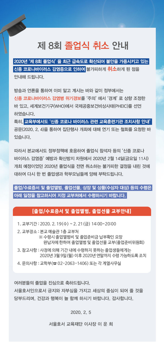 2020년 제 8회 졸업식을 최근 급속도로 확산되어 불안을 가중시키고 있는 ‘신종 코로나바이러스 감염증’으로 인하여 불가피하게 취소하게 된 점을 안내해 드립니다.