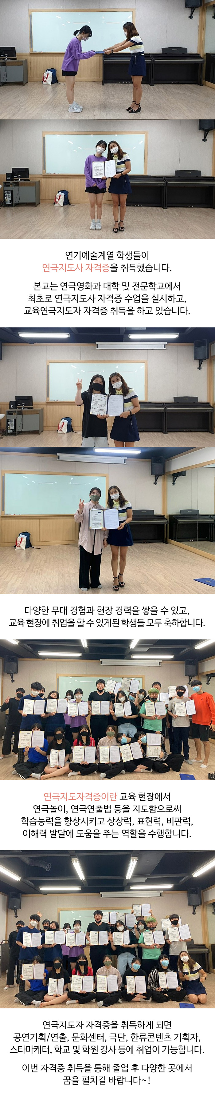 본교는 연극영화과 대학 및 전문학교에서 최초로 연극지도사 자격증 수업을 실시하고, 교육연극지도자 자격증 취득을 하고 있습니다.
