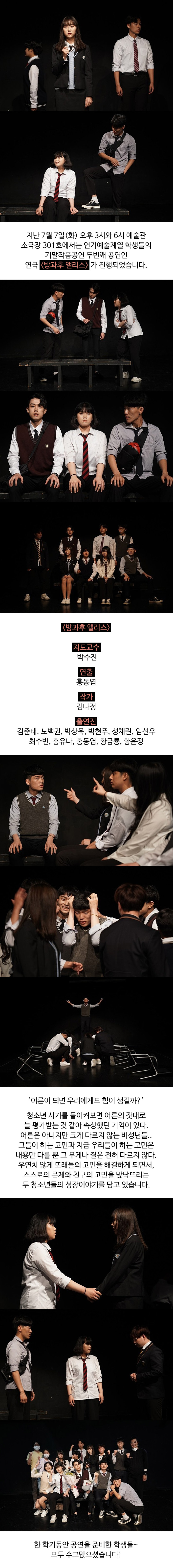 지난 7월 7일 화요일 오후 3시와 6시 예술관 소극장 301호에서는 연기예술계열 학생들의 기말작품공연 두번째 공연인 연극 '방과후 앨리스'가 진행되었습니다.