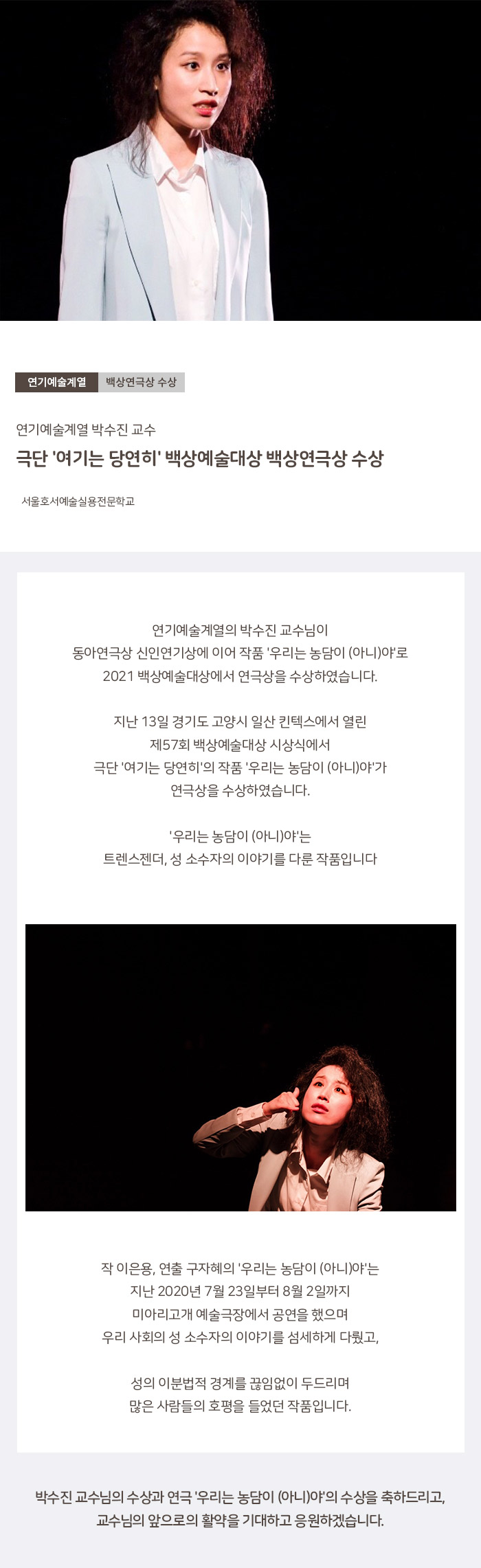 연기예술계열 박수진 교수 극단 '여기는 당연히' 백상예술대상 백상연극상 수상