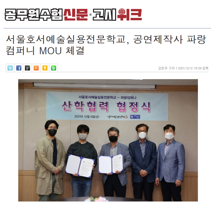 이날 협약식에는 서울호서예전 김남균 학장, 김형탁 부학장, 하승래 교학처장, 연기예술계열의 경규원 계열부장과 파랑컴퍼니 정진국 대표가 참여하였다.