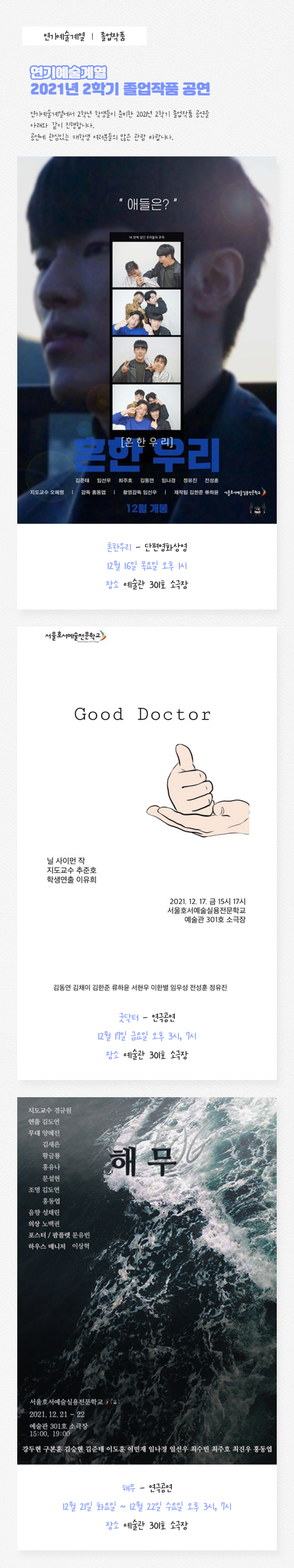 서울호서예술실용전문학 연기예술계열 2021년 2학기 졸업작품 공연 연기예술계열에서 2학년 학생들이 준비한 2021년 2학기 졸업작품 공연을 아래와 같이 진행합니다. 공연에 관심있는 재학생 여러분들의 많은 관람 바랍니다.
