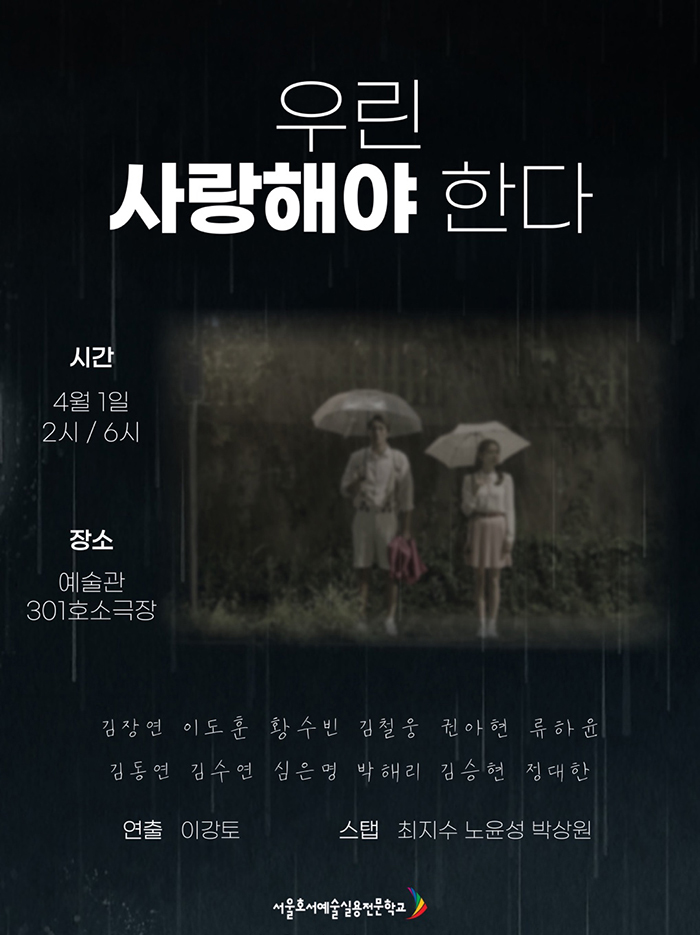 연기예술계열 학생들이 준비한 뮤지컬공연 <우린 사랑해야 한다>가 오는 4월 1일(금) 오후 2시와 6시에 예술관 소극장에서 공연합니다. 공연에 관심있는 재학생 여러분의 많은 관람 바랍니다.