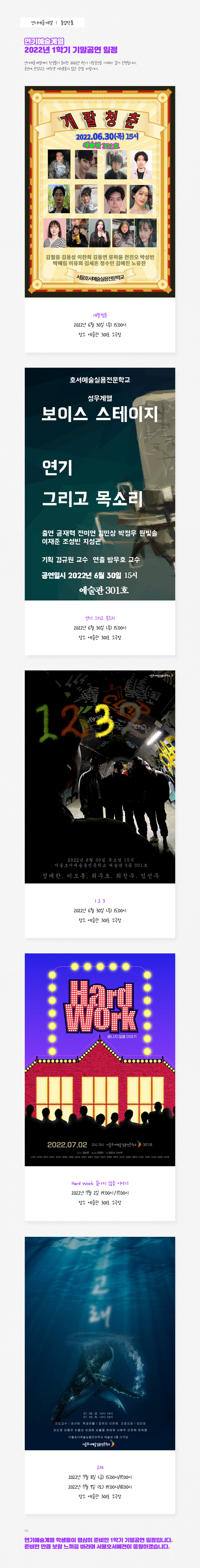 연기예술계열 학생들이 열심히 준비한 1학기 기말공연 일정입니다. 준비한 만큼 보람 느끼길 바라며 서울호서예전이 응원하겠습니다.