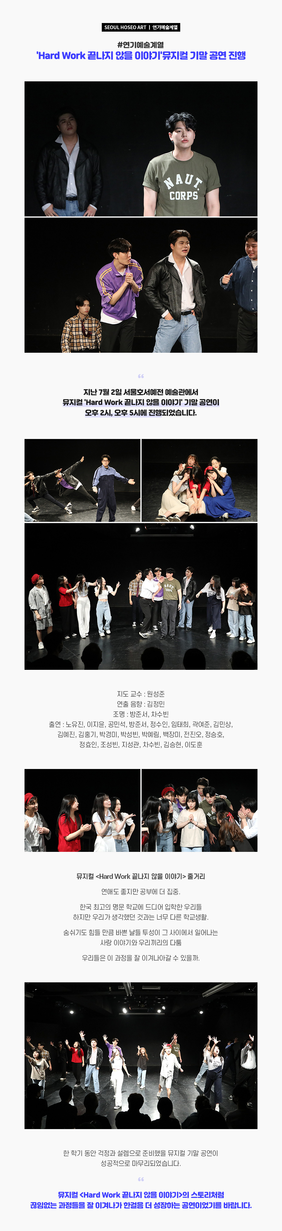 지난 7월 2일 서울호서예전 예술관에서 뮤지컬 'Hard Work 끝나지 않을 이야기' 기말 공연이 오후 2시, 오후 5시에 진행되었습니다. ? 한 학기 동안 걱정과 설렘으로 준비했을 뮤지컬 기말 공연이 성공적으로 마무리되었습니다. 뮤지컬