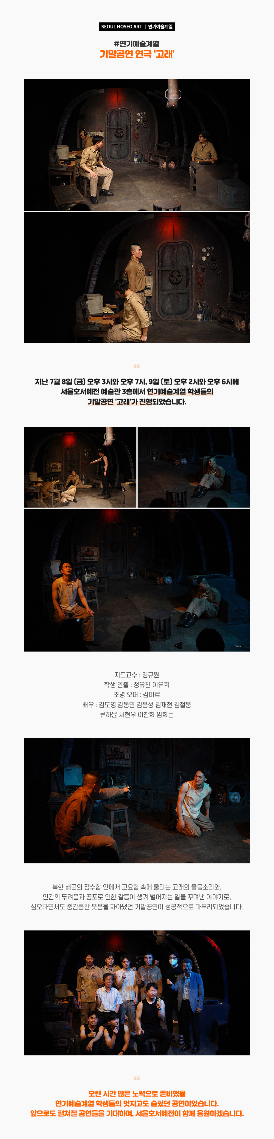 지난 7월 8일 (금) 오후 3시와 오후 7시, 9일 (토) 오후 2시와 오후 6시에 서울호서예전 예술관 3층에서 연기예술계열 학생들의 기말공연 '고래'가 진행되었습니다. 북한 해군의 잠수함 안에서 고요함 속에 울리는 고래의 울음소리와, 인간의 두려움과 공포로 인한 갈등이 생겨 벌어지는 일을 꾸며낸 이야기로, 심오하면서도 중간중간 웃음을 자아냈던 기말공연이 성공적으로 마무리되었습니다.