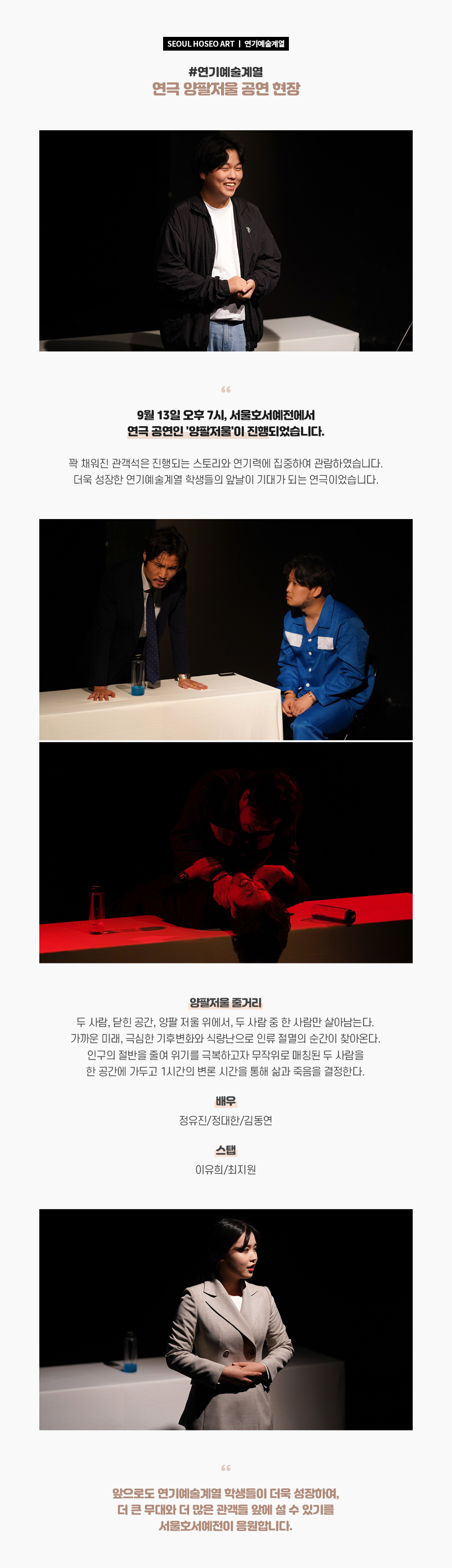 9월 13일 오후 7시, 서울호서예전에서 연극 공연인 '양팔저울'이 진행되었습니다. 꽉 채워진 관객석은 진행되는 스토리와 연기력에 집중하여 관람하였습니다. 더욱 성장한 연기예술계열 학생들의 앞날이 기대가 되는 연극이었습니다.