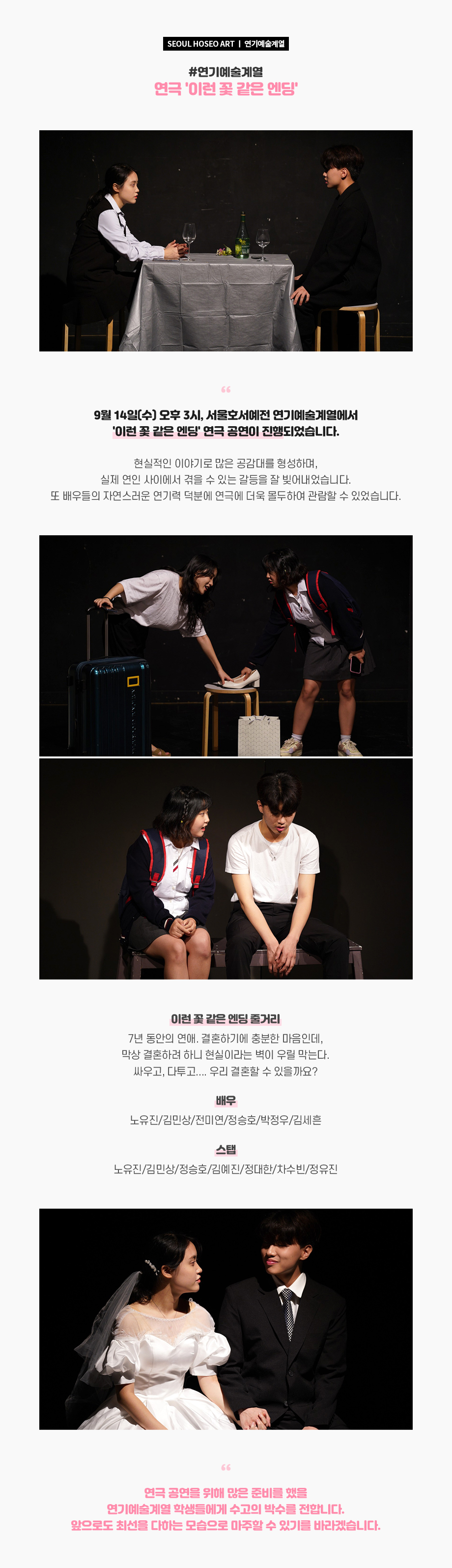 월 14일(수) 오후 3시, 서울호서예전 연기예술계열에서 '이런 꽃 같은 엔딩' 연극 공연이 진행되었습니다. 현실적인 이야기로 많은 공감대를 형성하며, 실제 연인 사이에서 겪을 수 있는 갈등을 잘 빚어내었습니다.