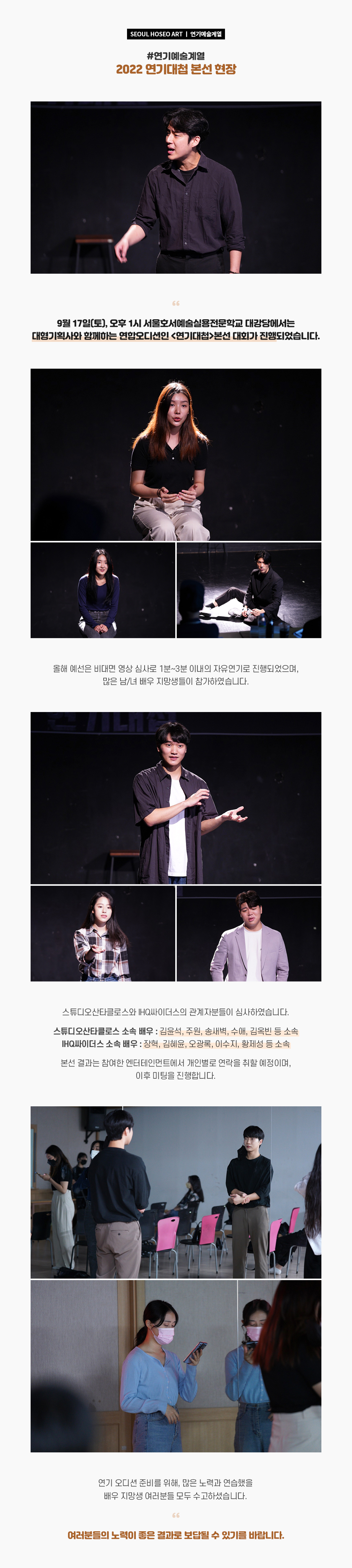 9월 17일(토), 오후 1시 서울호서예술실용전문학교 대강당에서는 대형기획사와 함께하는 연합오디션인 <연기대첩>본선 대회가 진행되었습니다. 올해 예선은 비대면 영상 심사로 1분~3분 이내의 자유연기로 진행되었으며, 많은 남/녀 배우 지망생들이 참가하였습니다.