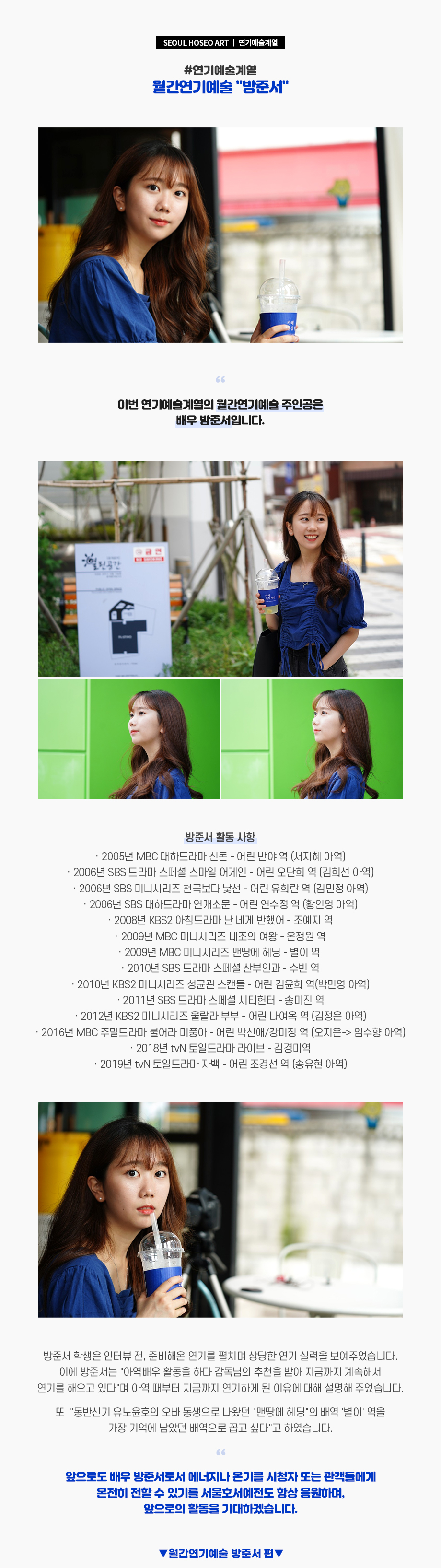 이번 연기예술계열의 월간연기예술 주인공은 배우 방준서입니다. 방준서 학생은 인터뷰 전, 준비해온 연기를 펼치며 상당한 연기 실력을 보여주었습니다. 이에 방준서는 "아역배우 활동을 하다 감독님의 추천을 받아 지금까지 계속해서 연기를 해오고 있다"며 아역 때부터 지금까지 연기하게 된 이유에 대해 설명해 주었습니다.