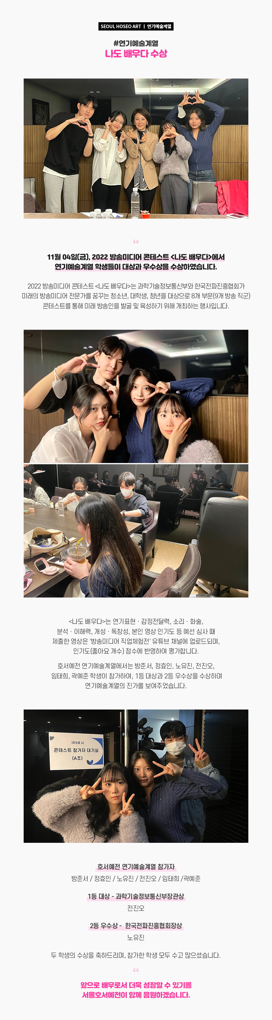 11월 04일(금), 2022 방송미디어 콘테스트 <나도 배우다>에서 연기예술계열 학생들이 대상과 우수상을 수상하였습니다. 2022 방송미디어 콘테스트 <나도 배우다>는 과학기술정보통신부와 한국전파진흥협회가 미래의 방송미디어 전문가를 꿈꾸는 청소년, 대학생, 청년을 대상으로 8개 부문(9개 방송 직군) 콘테스트를 통해 미래 방송인을 발굴 및 육성하기 위해 개최하는 행사입니다.