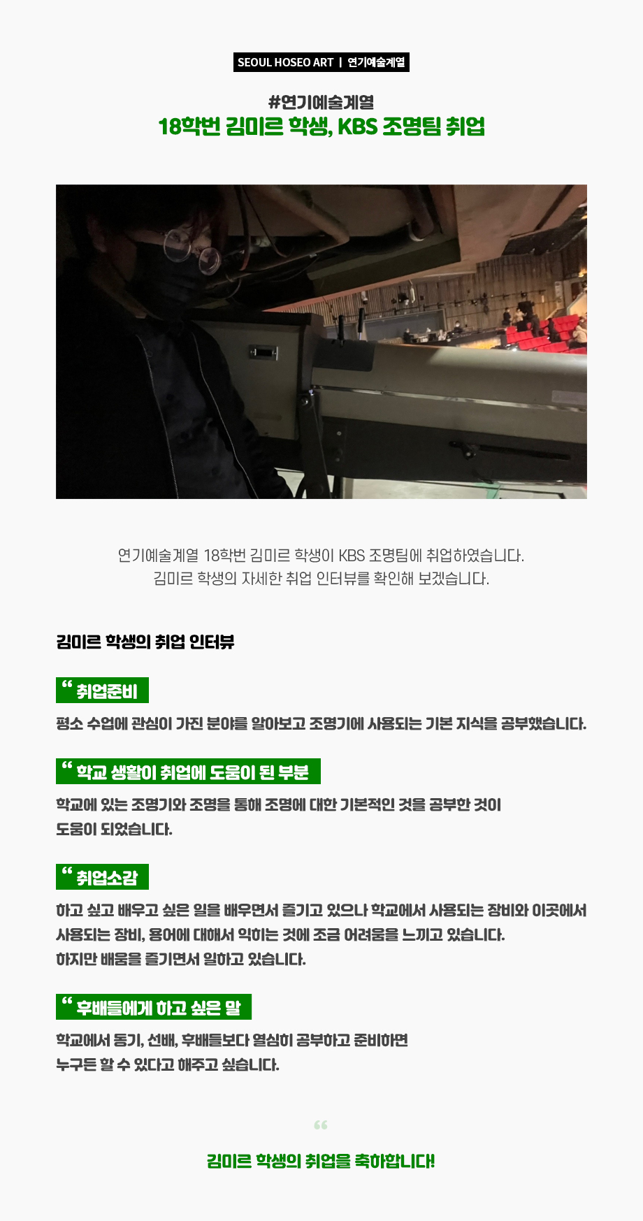 연기예술계열 18학번 김미르 학생, KBS 조명팀 취업