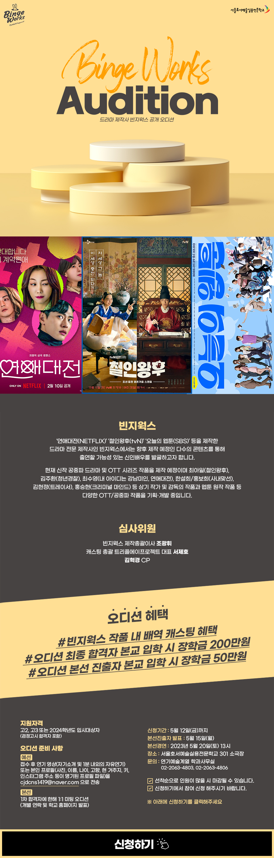 서울호서예술실용전문학교 연기예술계열 ‘연애대전(NETFLIX)’ ‘철인왕후(tvN)’ 등 드라마 제작사 빈지웍스 공개 오디션 신청하기