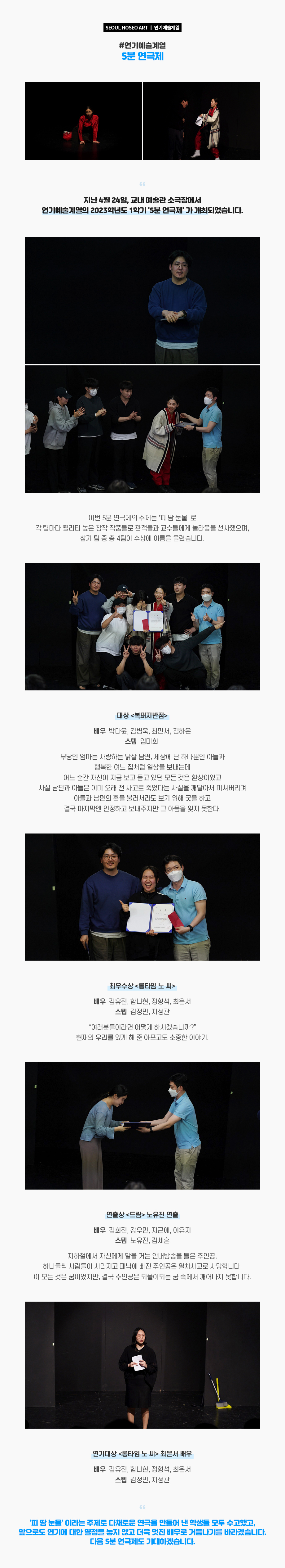 지난 4월 24일, 교내 예술관 소극장에서 연기예술계열의 2023학년도 1학기 '5분 연극제' 가 개최되었습니다. 이번 5분 연극제의 주제는 '피 땀 눈물' 로 각 팀마다 퀄리티 높은 창작 작품들로 관객들과 교수들에게 놀라움을 선사했으며, 참가 팀 중 총 4팀이 수상에 이름을 올렸습니다.