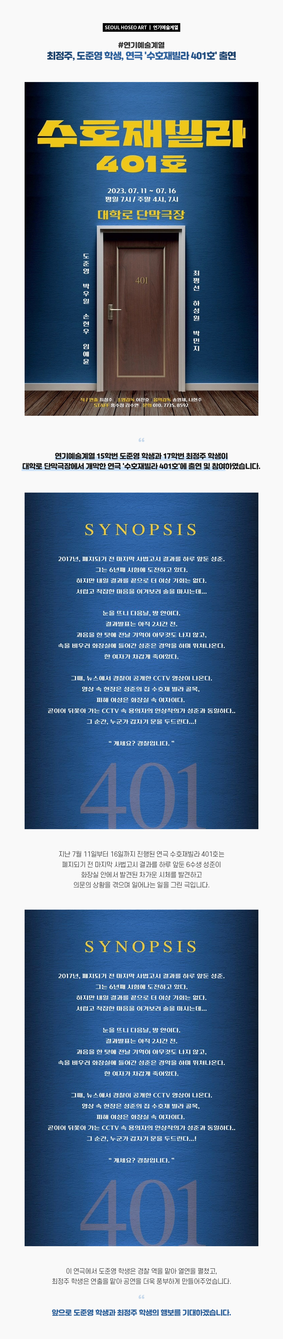 연기예술계열 15학번 도준영 학생과 17학번 최정주 학생이 대학로 단막극장에서 개막한 연극 '수호재빌라 401호'에 출연 및 참여하였습니다. 지난 7월 11일부터 16일까지 진행된 연극 수호재빌라 401호는 폐지되기 전 마지막 사법고시 결과를 하루 앞둔 6수생 성준이 화장실 안에서 발견된 차가운 시체를 발견하고 의문의 상황을 겪으며 일어나는 일을 그린 극입니다.