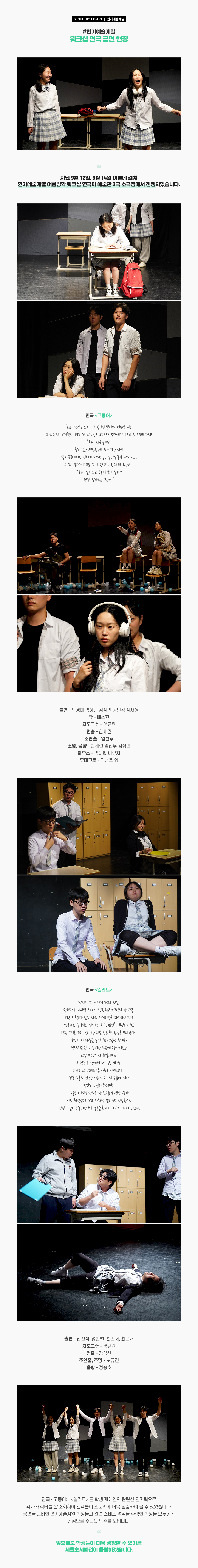지난 9월 12일, 9월 14일 이틀에 걸쳐 연기예술계열 여름방학 워크샵 연극이 예술관 3극 소극장에서 진행되었습니다.