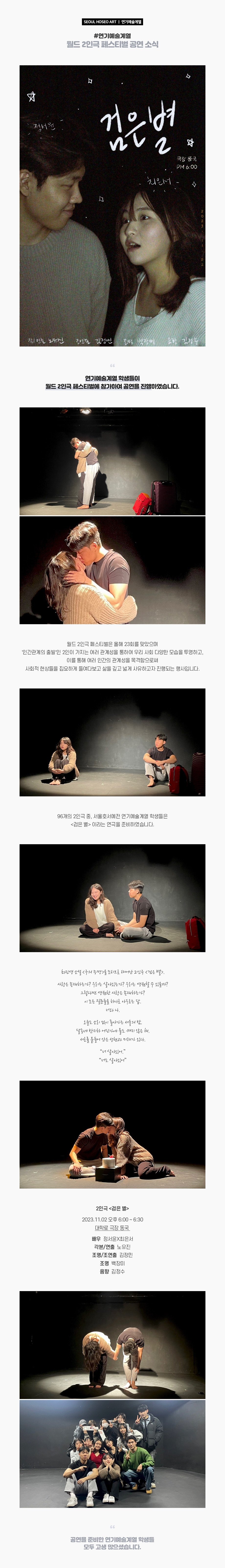 연기예술계열 학생들이 월드 2인극 페스티벌에 참가하여 공연을 진행하였습니다. 월드 2인극 페스티벌은 올해 23회를 맞았으며 '인간관계의 출발' 인 2인이 가지는 여러 관계성을 통하여 우리 사회 다양한 모습을 투영하고, 이를 통해 여러 인간의 관계성을 목격함으로써 사회적 현상들을 집요하게 들여다보고 삶을 깊고 넓게 사유하고자 진행되는 행사입니다.