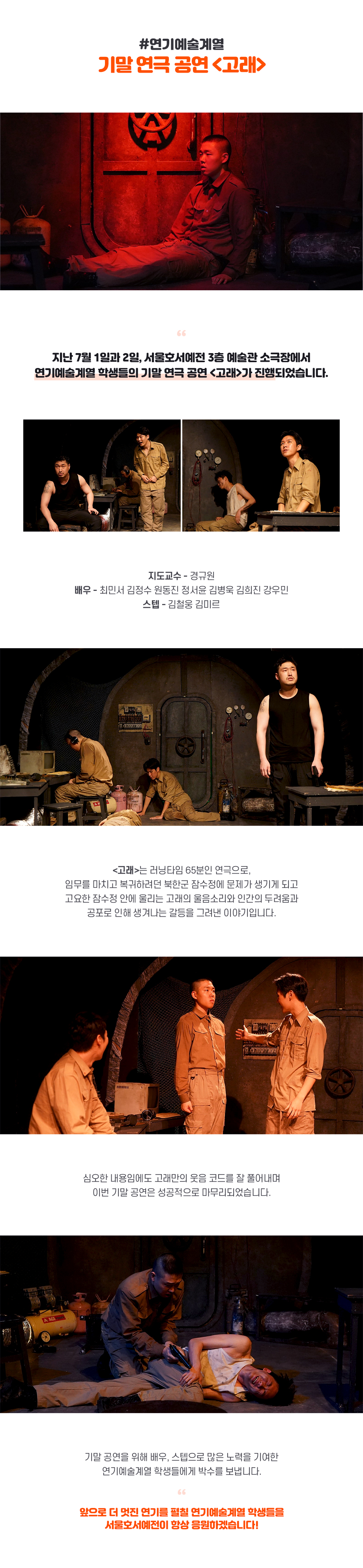 지난 7월 1일과 2일, 서울호서예전 3층 예술관 소극장에서 연기예술계열 학생들의 기말 연극 공연 <고래>가 진행되었습니다. <고래>는 러닝타임 65분인 연극으로 임무를 마치고 복귀하려던 북한군 잠수정에 문제가 생기게 되고, 고요한 잠수정 안에 울리는 고래의 울음소리와 인간의 두려움과 공포로 인해 생겨나는 갈등을 그려낸 이야기입니다.