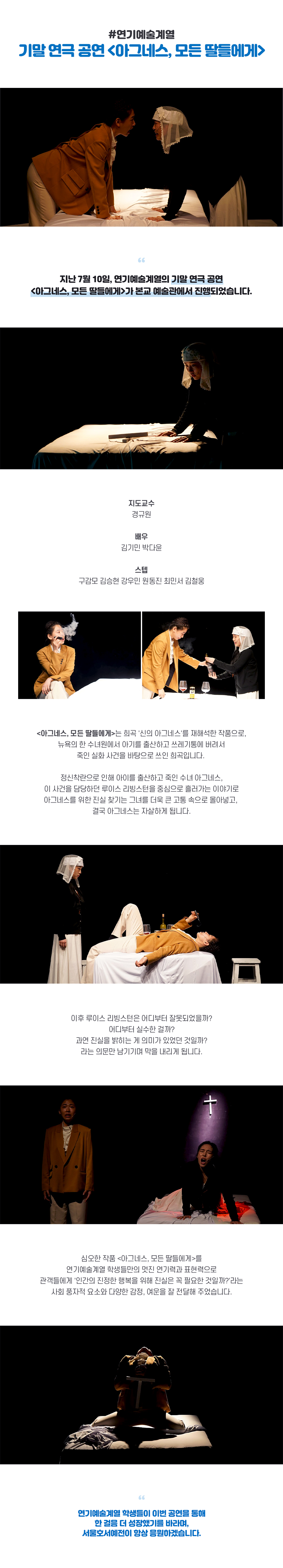 지난 7월 10일, 연기예술계열의 기말 연극 공연 <아그네스, 모든 딸들에게>가 본교 예술관에서 진행되었습니다. <아그네스, 모든 딸들에게>는 희곡 '신의 아그네스'를 재해석한 작품으로, 뉴욕의 한 수녀원에서 아기를 출산하고 쓰레기통에 버려서 죽인 실화 사건을 바탕으로 쓰인 희곡입니다.