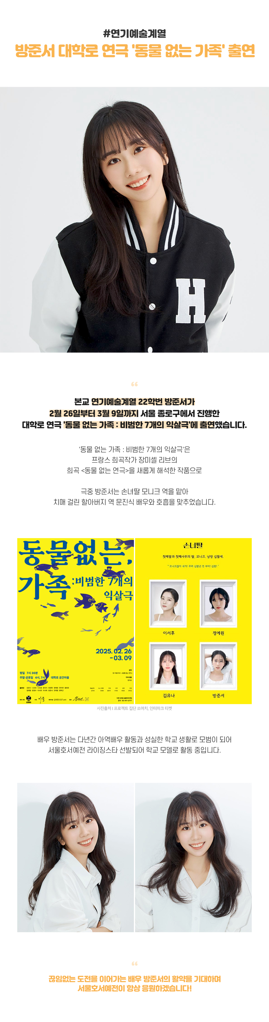 서울호서예술실용전문학교 연기예술계열 22학번 방준서가 2월 26일부터 3월 9일까지 서울 종로구에서 진행한 대학로 연극 '동물 없는 가족 : 비범한 7개의 익살극'에 출연했습니다. '동물 없는 가족 : 비범한 7개의 익살극'은 프랑스 희곡작가 장미셸 리브의 희곡 <동물 없는 연극>을 새롭게 해석한 작품으로 극중 방준서는 손녀딸 모니크 역을 맡아 치매 걸린 할아버지 역 문진식 배우와 호흡을 맞추었습니다.