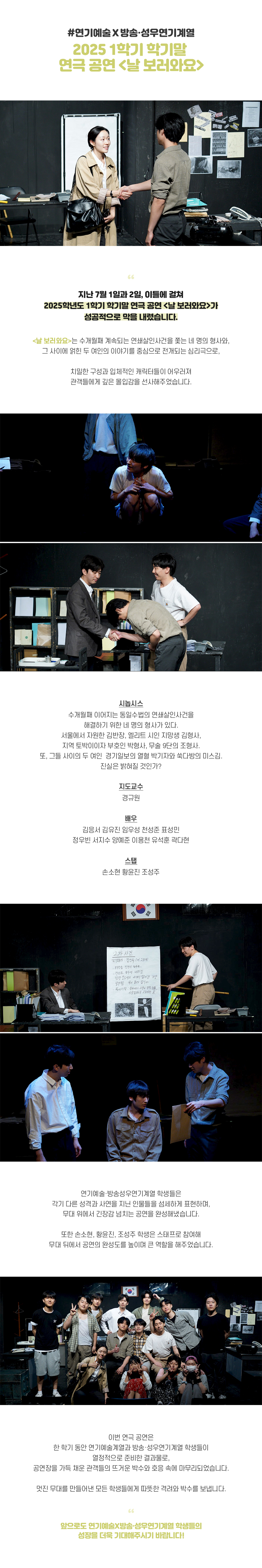 지난 7월 1일과 2일, 이틀에 걸쳐 2025학년도 1학기 학기말 연극 공연 <날 보러와요>가 성공적으로 막을 내렸습니다. <날 보러와요>는 수개월째 계속되는 연쇄살인사건을 쫓는 네 명의 형사와, 그 사이에 얽힌 두 여인의 이야기를 중심으로 전개되는 심리극으로, 치밀한 구성과 입체적인 캐릭터들이 어우러져 관객들에게 깊은 몰입감을 선사해주었습니다.