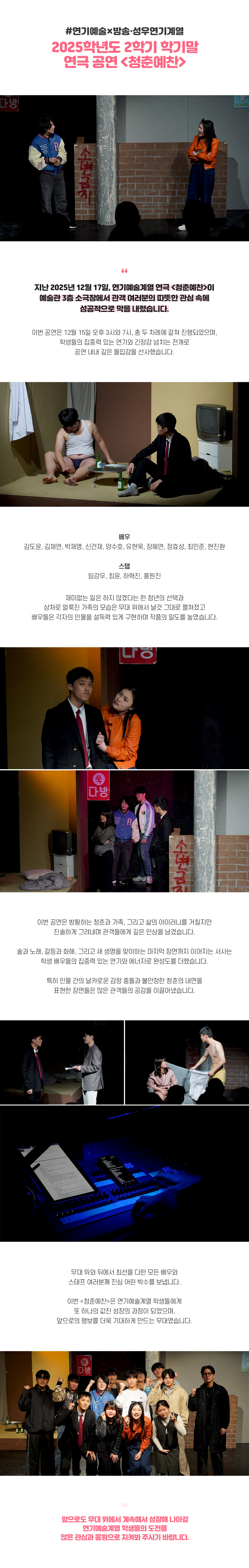 지난 2025년 12월 17일, 연기예술계열 연극 <청춘예찬>이 예술관 3층 소극장에서 관객 여러분의 따뜻한 관심 속에 성공적으로 막을 내렸습니다.