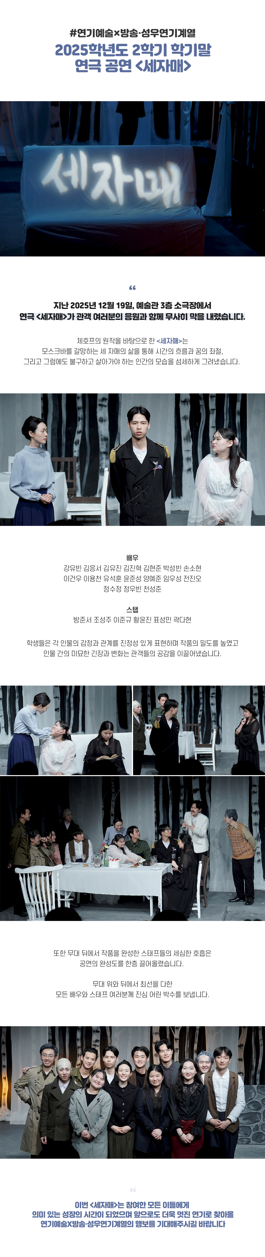 지난 2025년 12월 19일, 예술관 3층 소극장에서 연극 <세자매>가 관객 여러분의 응원과 함께 무사히 막을 내렸습니다.