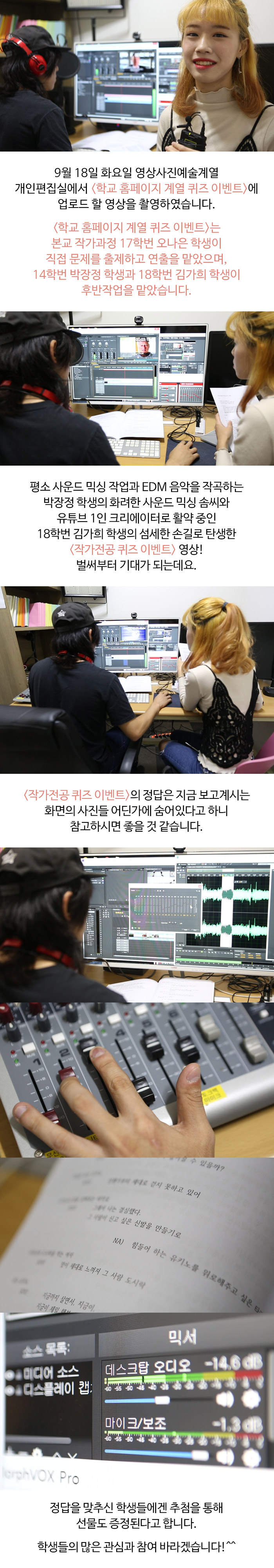 9월 18일 화요일 영상사진예술계열 개인편집실에서 <학교 홈페이지 계열 퀴즈 이벤트>에 업로드 할 영상을 촬영하였습니다.