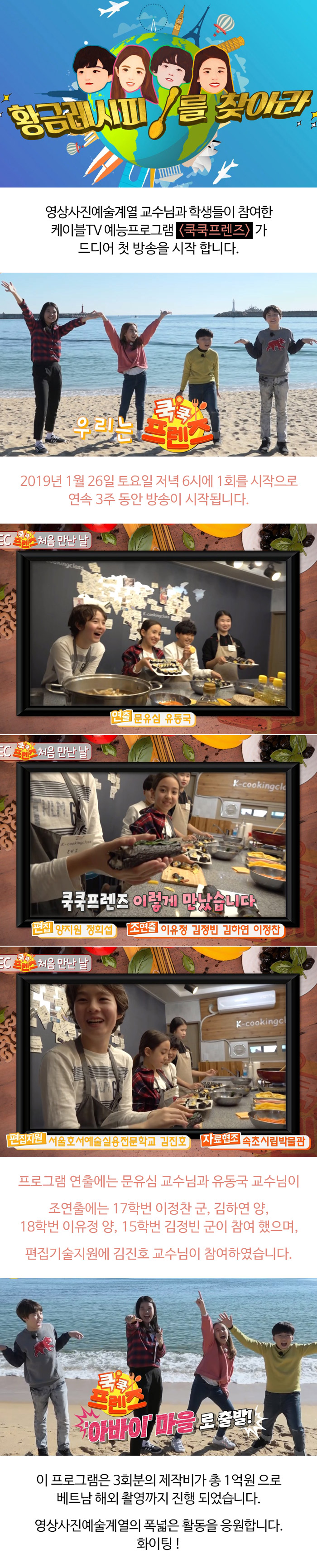 영상사진예술계열 교수님과 학생들이 참여한 케이블TV 예능프로그램 '쿡쿡프렌즈'가 드디어 첫 방송을 시작합니다.