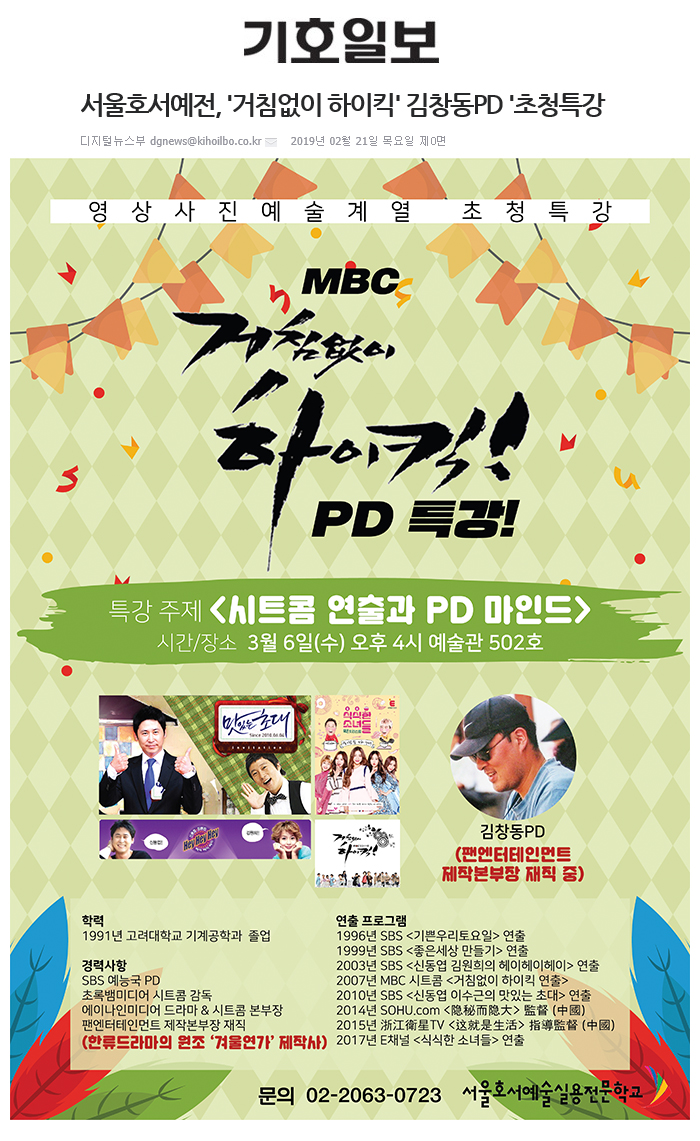 서울호서예술실용전문학교(이하 호서예전) 방송영화제작계열이 오는 3월 6일(수) 오후4시 팬엔터테인먼트 제작본부장 김창동PD 초청특강을 실시한다.