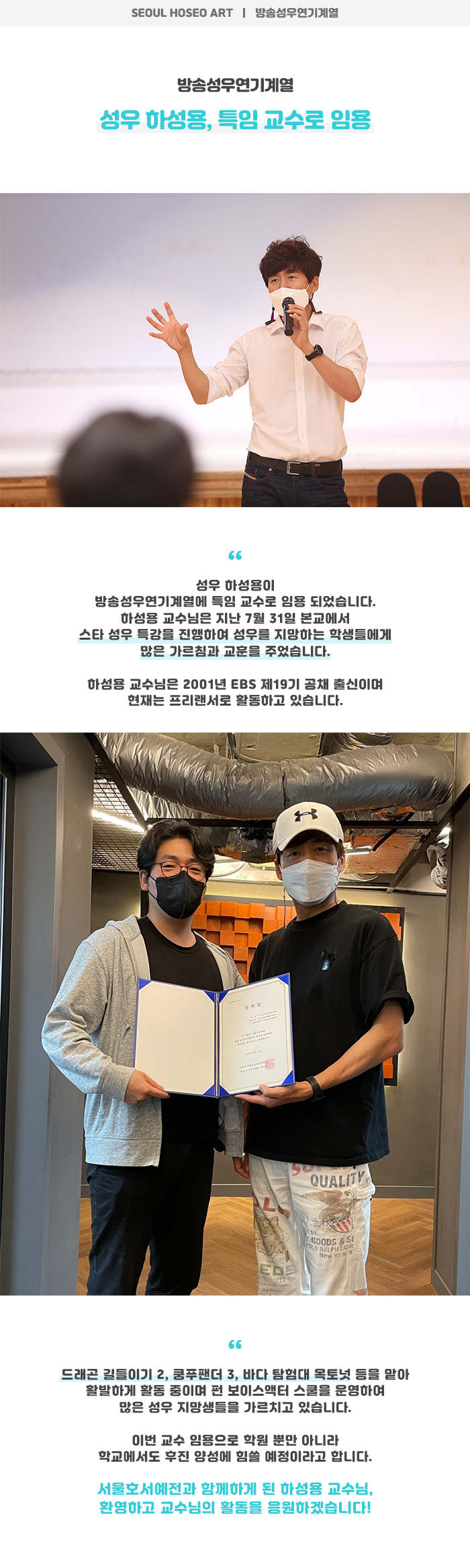 방송성우연기계열 성우 하성용, 특임 교수로 임용