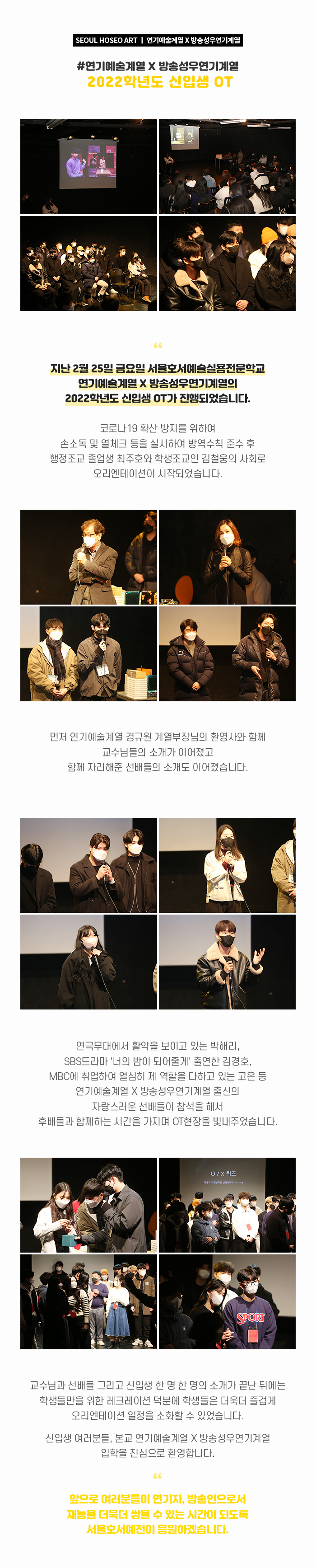 지난 2월 25일 금요일 서울호서예술실용전문학교 연기예술계열 X 방송성우연기계열의 2022학년도 신입생 OT가 진행되었습니다. 코로나19 확산 방지를 위하여 손소독 및 열체크 등을 실시하여 방역수칙 준수 후 행정조교 졸업생 최주호와 학생조교인 김철웅의 사회로 오리엔테이션이 시작되었습니다. 연극무대에서 활약을 보이고 있는 박해리, SBS드라마 '너의 밤이 되어줄게' 출연한 김경호, MBC에 취업하여 열심히 제 역할을 다하고 있는 고은 등 연기예술계열 X 방송성우연기계열 출신의 자랑스러운 선배들이 참석을 해서 후배들과 함께하는 시간을 가지며 OT현장을 빛내주었습니다.